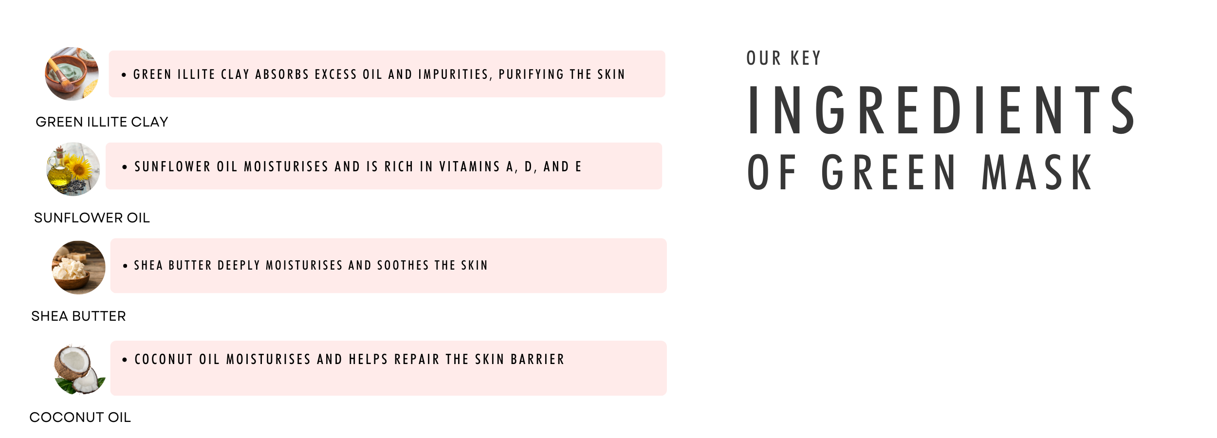 Aqua,Green Illite Clay, Cetearyl Alcohol, Polysorbate 60, Helianthus Annuus, Glycerine (Veg), Olea Europaea Oil, Cocos Nucifera Oil, Butyrospermum Parkii, Prunus Armeniaca (Apricot) Kernel Oil, Kaolin, Phenoxyethanol, Ethylhexylglycerin, Allantoin, Sodium Hyaluronate, Tocopherol, Avena sativa meal extract, Cucumis Sativus Oil, Camellia Sinensis Leaf, Stearic Acid, Zinc Oxide, Xanthan Gum, Pyrus Malus (Apple) Fruit Extract, Ficus Carica (Fig) Fruit Extract, Propylene Glycol, Sodium Benzoate, Potassium Sorbate, Citrus Aurantium Bergamia Fruit Oil, Citrus Aurantifolia (Lime) Oil, Citral, Linalool, Limonene