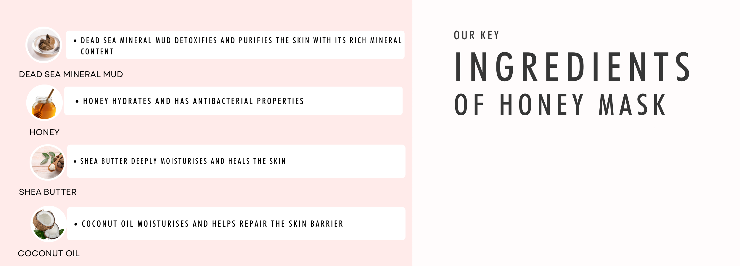 Honey Mask - Aqua, Maris limus (Dead Sea Mineral Mud), Cetearyl alcohol & Polysorbate 60 (Emulsifying Wax NF), Helianthus Annuus (Sunflower Oil), Vegetable glycerine, Olea Europaea (Olive Oil), Cocos Nucifera (Coconut Oil), Butyrospermum parkii (Shea Butter), Prunus armeniaca (Apricot Kernel Oil), Phenoxyethanol and Ethylhexylglycerin, Stearic acid, Hydroxypropyltrimonium Honey (Quaternized Honey SA), Musa Sapientum (Banana Extract), Punica Granatum (Pomegranate Oil), Xanthan Gum, Zinc Oxide, Allantoin, Avena sativa meal extract (Oat silk), Tocopherol (Vitamin E), Sodium hyaluronate.
