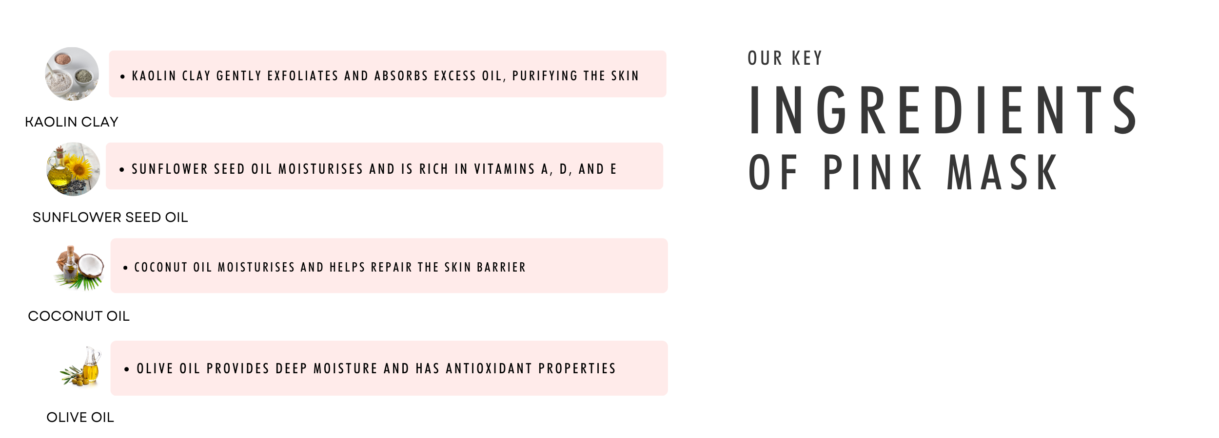 Aqua, Kaolin, Alkanna Tinctoria Root Extract, Cetearyl Alcohol, Glycerine, Helianthus Annuus (Sunflower) seed oil, Olea Europaea (olive) oil, Cocos Nucifera cocunut oil, Prunus Armeniaca (Apricot) Kernel Oil, Butyrospermum Parkii (Shea) Butter, Polysorbate 60, Phenoxyethanol, Stearic Acid, Zinc Oxide, Montmorillonite and Illite and Kaolin, Allantoin, Sodium Hyaluronate, Tocopherol, Avena Sativa (Oat) Meal Powder, Xanthan Gum, Ethylhexylglycerin, Vaccinium Macrocarpon (Cranberry) Fruit Extract, Cucumis Melo (Melon) Fruit Extract, Fragaria Vesca (Strawberry) Fruit Extract, Litsea Cubeba (May Chang) Fruit Oil, Jasminum Sambac (Jasmine) Flower Extract, Citrus Aurantium Dulcis (Sweet Orange) Peel Oil, Citrus Grandis (Grapefruit) Peel Oil, Limonene, Citral